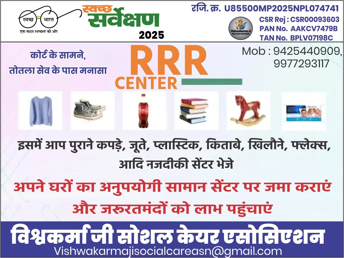 नीमच टुडे न्यूज़ | विश्वकर्मा जी सोशल केयर एसोसिएशन (एनजीओ संस्था) द्वारा कोर्ट के सामने तोतला सेव के पास जनपद पंचायत काम्पलेक्स मनासा में आर. आर. आर. सेंटर स्थापित किया गया है। यहां नगर एवं आसपास के ग्रामीण अपने घरों का अनपुयोगी सामान जैसे पुराने कपड़े, जूते, चप्पल, प्लास्टिक, किताबे, कम्बल स्वेटर मौजे, दस्ताने, मफलर, खिलौने, साडिया आदि जो किसी जरूरतमंद के लिए उपयोगी हो सकते है आप उन्हे विश्वकर्मा जी सोशल केयर एसोसिएशन को सौंप सकते है। इसके लिए एनजीओ संस्था ने मनासा में आर.आर.आर. सेंटर की स्थापना की है। 28 अक्टूबर को संस्था के डायरेक्टर कमलेश कारपेंटर, सचिव लक्ष्मीनारायण उपाध्याय, कोषाध्यक्ष सोनू शर्मा की उपस्थिति में शुभारंभ किया गया। शुभारंभ पर मनासा विधानसभा क्षेत्र की ग्राम पंचायत खानखेड़ी से विष्णु चौहान ने उक्त सेंटर पर पुराने कपड़े जमा कराएं। भाटखेड़ी के अनिल कारपेंटर भी गरीब जरूरतमंदों की सेवा करने पहुंचे। उन्होने भी आर.आर.आर सेंटर पर जूते, चप्पल, कपड़े सौंपे। विश्वकर्मा जी सोशल केयर एसोसिएशन के डायरेक्टर कमलेश कारपेंटर ने बताया मनासा नगर और आसपास के गांवों में भ्रमण कर भी संस्था सदस्यों द्वारा घरों का अनपुयोगी सामान जैसे पुराने कपड़े, जूते, चप्पल, प्लास्टिक, किताबे, कम्बल स्वेटर मौजे, दस्ताने, मफलर, खिलौने, आदि जो किसी जरूरतमंद के लिए उपयोगी हो सकते है उन्हें एकत्र किया जाएगा। प्राप्त सामग्री को बाद में गरीब और जरूरतमंद तक पहुंचाई जाएगी। संस्था सचिव लक्ष्मीनारायण उपाध्याय ने बताया आर.आर.आर. सेंटर गरीब जरूरतमंद के लिए एक महत्वपूर्ण केंद्र है। समस्त नागरिकों से अपील है जो आपके लिए अनुपयोगी सामग्री है लेकिन किसी गरीब जरूरतमंद के लिए उपयोगी बन सकती है वह आप सेंटर पर जमा कराए। साथ ही जिन जरूरतमंद गरीब को ठंड से बचने के लिए उनी वस्त्र, कपड़े की जरूरत है वह विश्वकर्मा जी सोशल केयर एसोसिएशन के आर.आर.आर. सेंटर से प्राप्त कर सकते है। गरीब जरूरतमंद के लिए शुरू किया गया यह केंद्र प्रतिदिन खुला रहेगा।