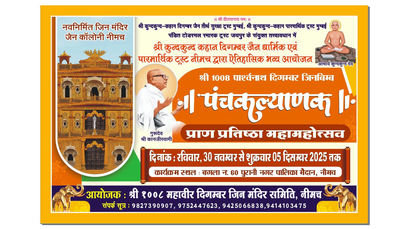 नीमच टुडे न्यूज| नीमच शहर में बड़ी संख्या में निवासरत जैन समाज के लिए 30 नवंबर से लेकर 6 दिसंबर तक के दिन धर्ममय होंगे। एक तरह से महाकुंभ जैसा नजारा नीमच दिखेगा। बड़ी संख्या में जैन समाजजन नीमच आएंगे और जिन मंदिर के पंच कल्याणक प्राण-प्रतिष्ठा महोत्सव में शामिल होंगे। इस आयोजन के लिए श्री 1008 महावीर दिंगबर जिन मंदिर समिति नीमच व्यापाक स्तर पर तैयारी की जा रही है। मंदिर भगवान महावीर सहित 24 तीर्थकरों की प्राण-प्रतिष्ठा होगी और पंचकल्याणक महोत्सव बंगला- नंबर- 60 में मनाया जाएगा। छह दिन तक चलने वाले आयोजन में देशभर से जैन बंधु नीमच आएंगे और इस भव्य धार्मिक अनुष्ठान में शामिल होंगे। बंगला नंबर- 60 में होने वाले पंच कल्याणक महोत्सव के लिए विशाल मंच और पंडाल तैयार किया जा रहा है। छह दिन तक सभी धार्मिक अनुष्ठान होंगे। इसके साथ ही जन्म कल्याणक महोत्सव को नीमच शहर में भव्य शोभायात्रा निकाली जाएगी, जिसमें करीब 10 हजार लोगों के आयोजन में शामिल होंगे।