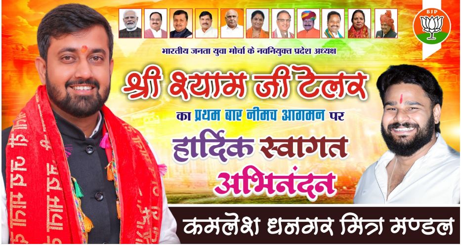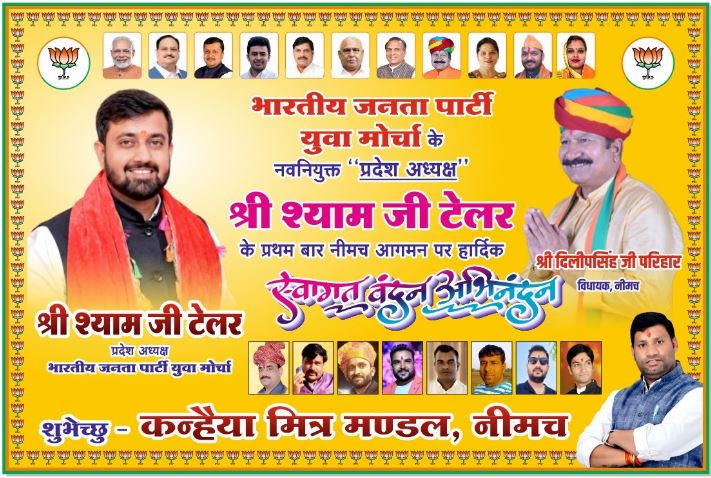 भाजपा प्रदेशाध्यक्ष श्याम टेलर का भाजपा नेता कन्हैयलाल पुरोहित के नेतृत्व में जवासा चौराहे पर भव्य स्वागत किया जाएगा। इसके लिए 101 किलो माला तैयार की गई है। युवाओ की भीड़ के साथ भाजपा प्रदेशायक्ष का स्वागत किया जाएगा।