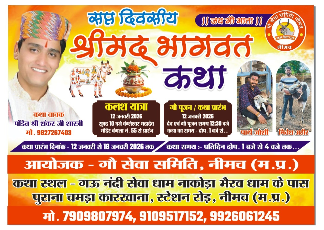 नीमच टुडे न्यूज़ । नीमच शहर के गौ नंदी सेवा धाम, पुराने चमड़ा कारखाना परिसर में 12 जनवरी से 18 जनवरी तक सात दिवसीय संगीतमय श्रीमद भागवत कथा का भव्य आयोजन किया जा रहा है। यह कथा प्रसिद्ध कथावाचक एवं विद्वान पंडित शंकर शास्त्री के मुखारविंद से संपन्न होगी। आयोजन का उद्देश्य गौ सेवा एवं धार्मिक चेतना का प्रसार बताया गया है। गौ सेवा समिति के अध्यक्ष पार्थ जोशी एवं सचिव मितेश अहीर ने संयुक्त रूप से जानकारी देते हुए बताया कि कथा के शुभारंभ अवसर पर 12 जनवरी को प्रातः 10 बजे कलश यात्रा निकाली जाएगी।