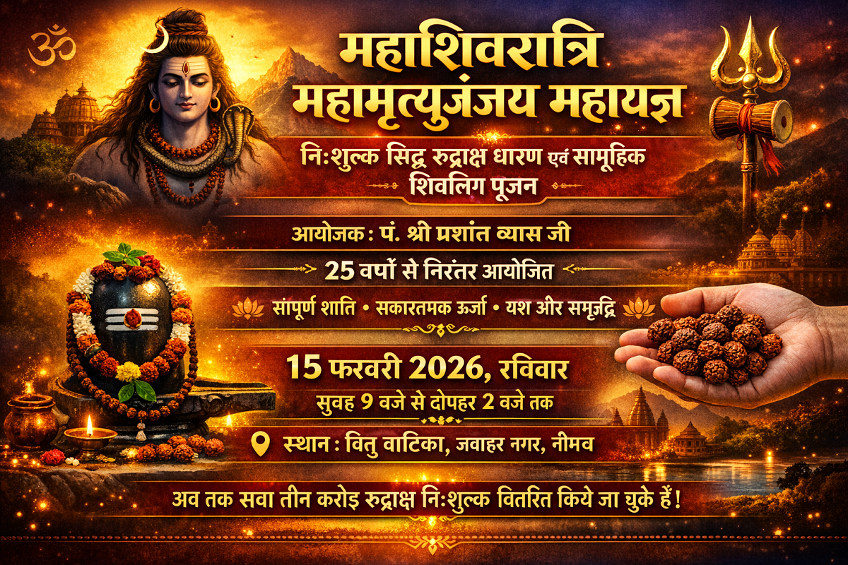 नीमच टुडे न्यूज़ | नीमच महाशिवरात्रि के अवसर पर महामृत्युंजय महायज्ञ 25 वर्षों से निरंतर आयोजित किया जा रहा है। यह यज्ञ समस्त धर्मजन के जीवन में सुख, शांति, आरोग्य, रक्षा और समृद्धि की कामना के लिए किया जाता है। इस बार यज्ञ में गुरुदेव पं. प्रशांत व्यास द्वारा विशेष विधि से अभिमंत्रित सिद्ध रूद्राक्ष श्रद्धालुओं को विधिवत् धारण करवाए जाएंगे। श्रद्धालुओं को निःशुल्क रूद्राक्ष धारण करने का अवसर मिलेगा, जो मानसिक शांति, सकारात्मक ऊर्जा, भाग्योदय, यश, धन, कार्यक्षेत्र लाभ और रोग, भय व संकट से सुरक्षा में सहायक माना जाता है। यज्ञ के दौरान विश्वशांति हेतु रुद्राक्ष से बने दिव्य शिवलिंग की सामूहिक पूजा, शिव स्तुतियां, शिवतांडव, महिषासुरमर्दिनी स्त्रोतम् एवं रूद्राक्ष और शिवमहिमा पर विशेष उद्बोधन प्रस्तुत किया जाएगा। यह कार्यक्रम 15 फरवरी 2026, रविवार, विनु वाटिका, जवाहर नगर, नीमच में सुबह 9 बजे से दोपहर 2 बजे तक आयोजित होगा। गुरुदेव पं. व्यासजी द्वारा अब तक सवा तीन करोड़ रूद्राक्ष निःशुल्क श्रद्धालुओं को प्रदान किए जा चुके हैं।