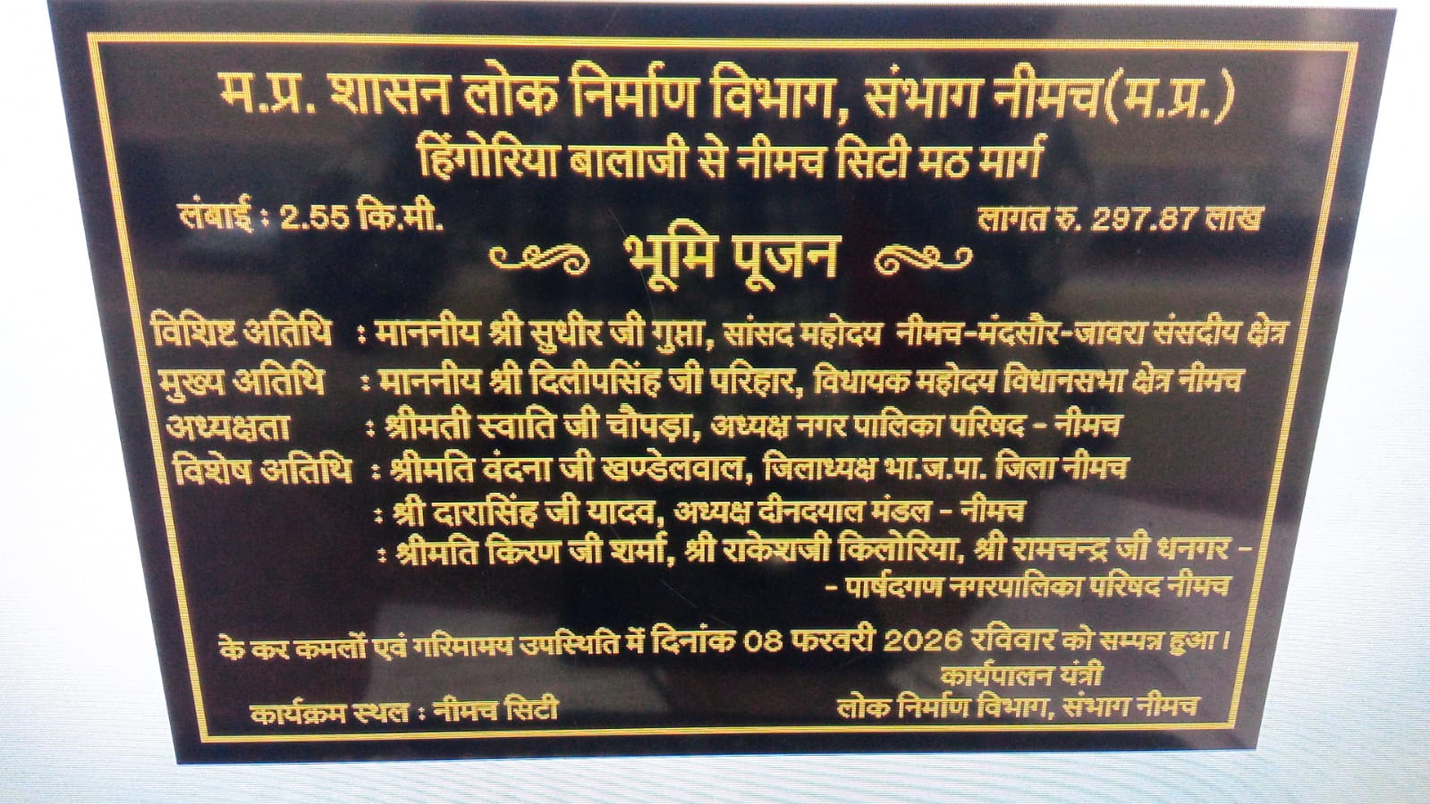 नीमच टुडे न्यूज़ | हिंगोरिया बालाजी से नीमच सिटी मठ मार्ग का भूमिपूजन रविवार 8 फरवरी 2026 को प्रातः 11 बजे आयोजित किया जाएगा। इस अवसर पर क्षेत्रीय सांसद सुधीर गुप्ता विशिष्ट अतिथि के रूप में उपस्थित रहेंगे, जबकि विधायक दिलीपसिंह परिहार मुख्य अतिथि और नपाध्यक्ष स्वाति चौपड़ा अध्यक्षता करेंगे। कार्यक्रम मीणा मोहल्ला, नीमच सिटी में संपन्न होगा। भूमिपूजन में भाजपा जिलाध्यक्ष वंदना खंडेलवा, दीनदयाल मंडल अध्यक्ष दारासिंह यादव और पार्षदों की उपस्थिति भी रहेगी।