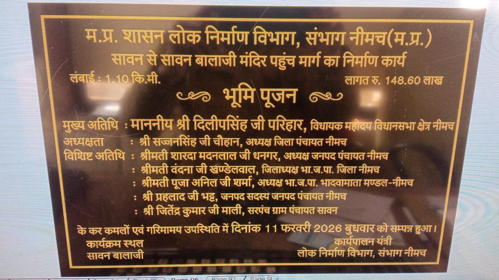नीमच टुडे न्यूज़ | नीमच सावन से सावन बालाजी मंदिर तक पहुंच मार्ग का भूमिपूजन और 15 लाख रुपए की लागत से निर्मित डोम का लोकार्पण आज बुधवार को प्रातः 11.30 बजे होगा। इस कार्यक्रम में नीमच विधायक दिलीपसिंह परिहार मुख्य अतिथि होंगे, जबकि जिला पंचायत नीमच अध्यक्ष सज्जनसिंह चौहान कार्यक्रम की अध्यक्षता करेंगे। समारोह में जनपद पंचायत नीमच अध्यक्ष शारदा मदनलाल धनगर, भाजपा जिलाध्यक्ष वंदना खण्डेलवाल, भाजपा भादवामाता मंडल अध्यक्ष पूजा अनिल शर्मा, जनपद सदस्य प्रहलाद भट्ट और ग्राम पंचायत सावन के सरपंच जितेन्द्रकुमार माली विशेष अतिथि के रूप में उपस्थित रहेंगे। इस परियोजना में 1.75 करोड़ रुपए की लागत से 1.10 किलोमीटर लंबा मार्ग निर्मित किया जाएगा। नया मार्ग बन जाने से सावन से बालाजी मंदिर तक आवागमन और अधिक सुविधाजनक होगा। वहीं, 15 लाख रुपए की लागत से निर्मित डोम का सामुदायिक उपयोग भी किया जा सकेगा, जिससे ग्रामीणजन इसका लाभ उठा सकेंगे। इस कार्यक्रम से क्षेत्र में धार्मिक और सामुदायिक गतिविधियों को बढ़ावा मिलेगा।