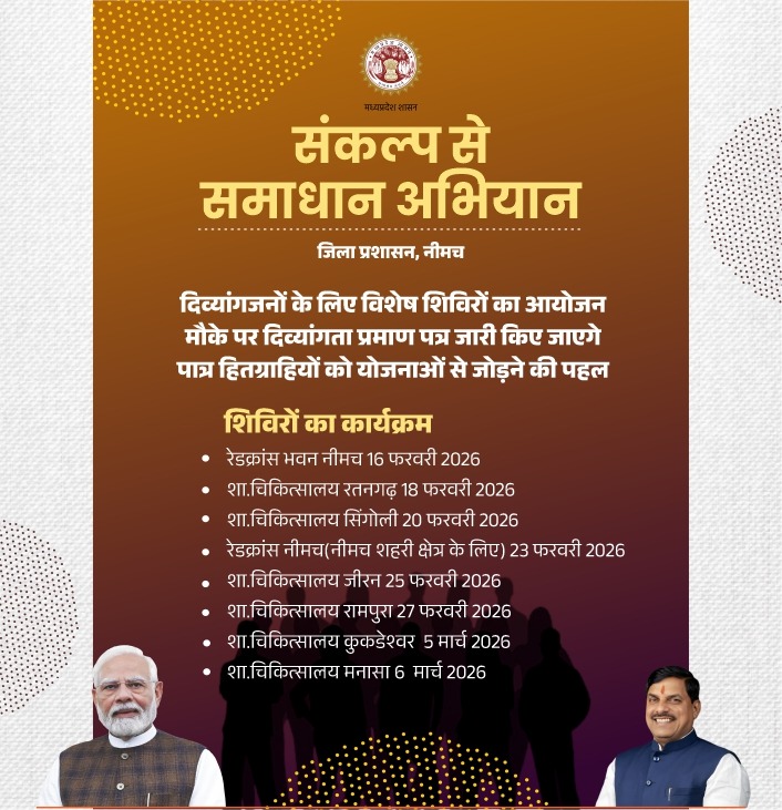 नीमच टुडे न्यूज़ | नीमच प्रदेश में संचालित “संकल्प से समाधान” अभियान के तहत रेडक्रास परिसर नीमच में 16 फरवरी को प्रातः 10 बजे से शाम 4 बजे तक दिव्यांगता प्रमाण पत्र शिविर आयोजित किया जाएगा। मुख्यमंत्री डॉ. मोहन यादव के निर्देश एवं कलेक्टर हिमांशु चंद्रा के मार्गदर्शन में आयोजित इस शिविर में महिला एवं बाल विकास, शिक्षा, जनजातीय कार्य, पंचायत एवं ग्रामीण विकास, आयुष तथा लोक स्वास्थ्य एवं परिवार कल्याण विभाग संयुक्त रूप से भाग लेंगे।