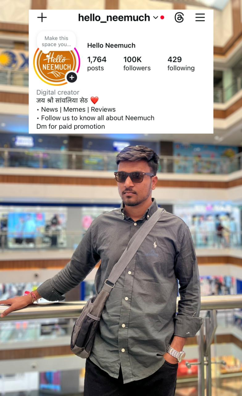 नीमच टुडे न्यूज़। सोशल मीडिया के माध्यम से शहर की खबरें और जानकारी लोगों तक पहुंचाने वाला इंस्टाग्राम पेज “Hello Neemuch” अब 1 लाख (100K) फॉलोअर्स का आंकड़ा पार कर चुका है। इस पेज के माध्यम से शहर की खबरें, सामाजिक गतिविधियां, मीम्स, रिव्यू और अन्य महत्वपूर्ण जानकारी नियमित रूप से साझा की जाती है। इस पेज का संचालन हरिओम पाटीदार द्वारा किया जाता है। उन्होंने बताया कि वे नीमच शहर में एसएससी की तैयारी करने आए थे, लेकिन पढ़ाई में उनका मन नहीं लगा। इसके बाद उन्होंने नीमच शहर को समझना शुरू किया और यहां की खबरों व गतिविधियों को सोशल मीडिया के माध्यम से लोगों तक पहुंचाने का प्रयास किया।